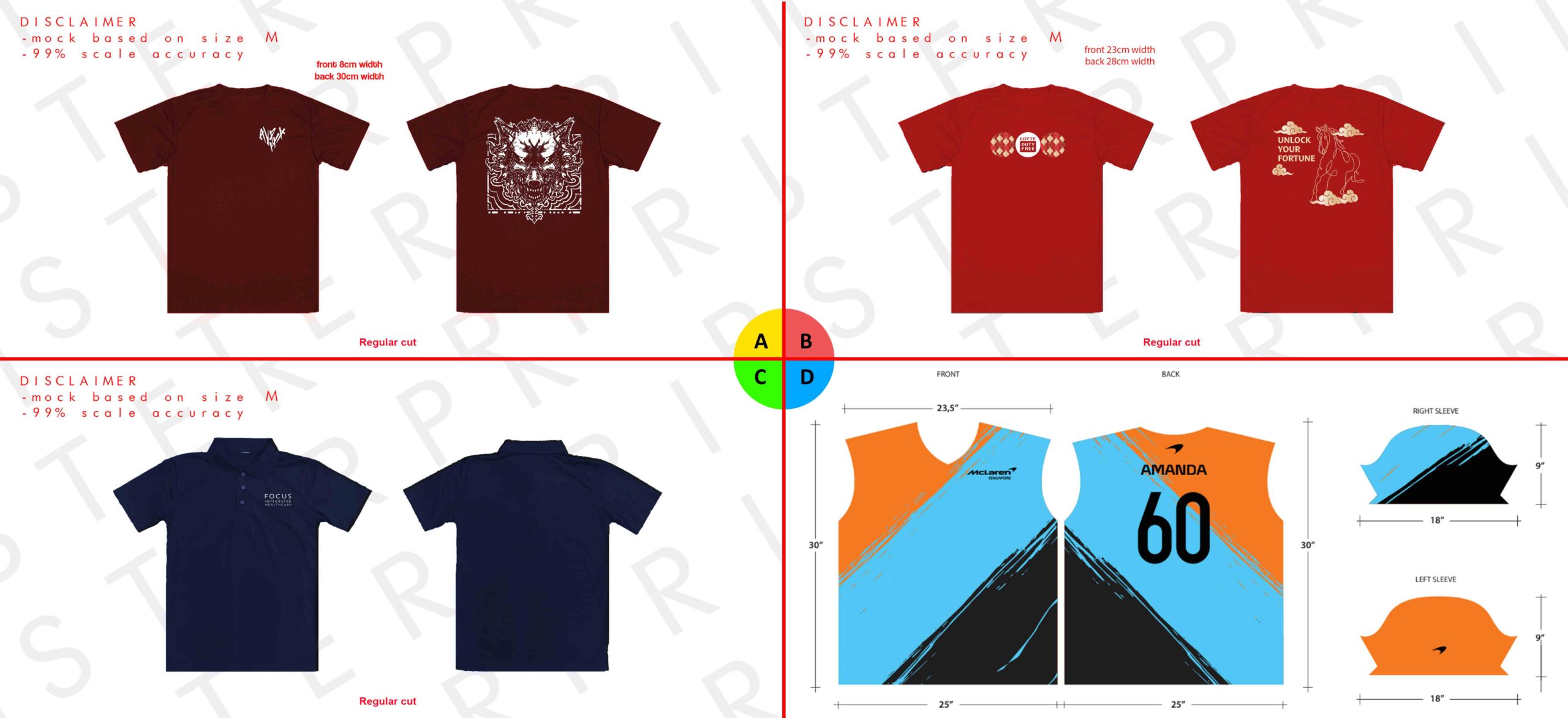 Use the examples above to identify the t-shirt print size, placement, and printing style closest to what you’re looking for. These references help us better understand your custom t-shirt printing requirements and provide more accurate recommendations and quotations.